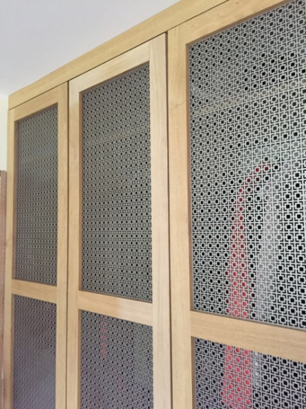 - Portes de Buffet ou ouverture d’Armoire : Remplacez les portes traditionnelles en panneau bois d’un buffet, d’une armoire ou d’une commode par des panneaux en tôle perforée. Cela ajoute une texture visuelle intéressante tout en permettant une ventilation pour le contenu à l’intérieur, l’utilisation des deux matériaux forme un beau mariage. La taille du motif perforé rend le motif visible, ni trop grand, ni trop petit, les proportions s’associent très bien avec le mobilier intérieur.