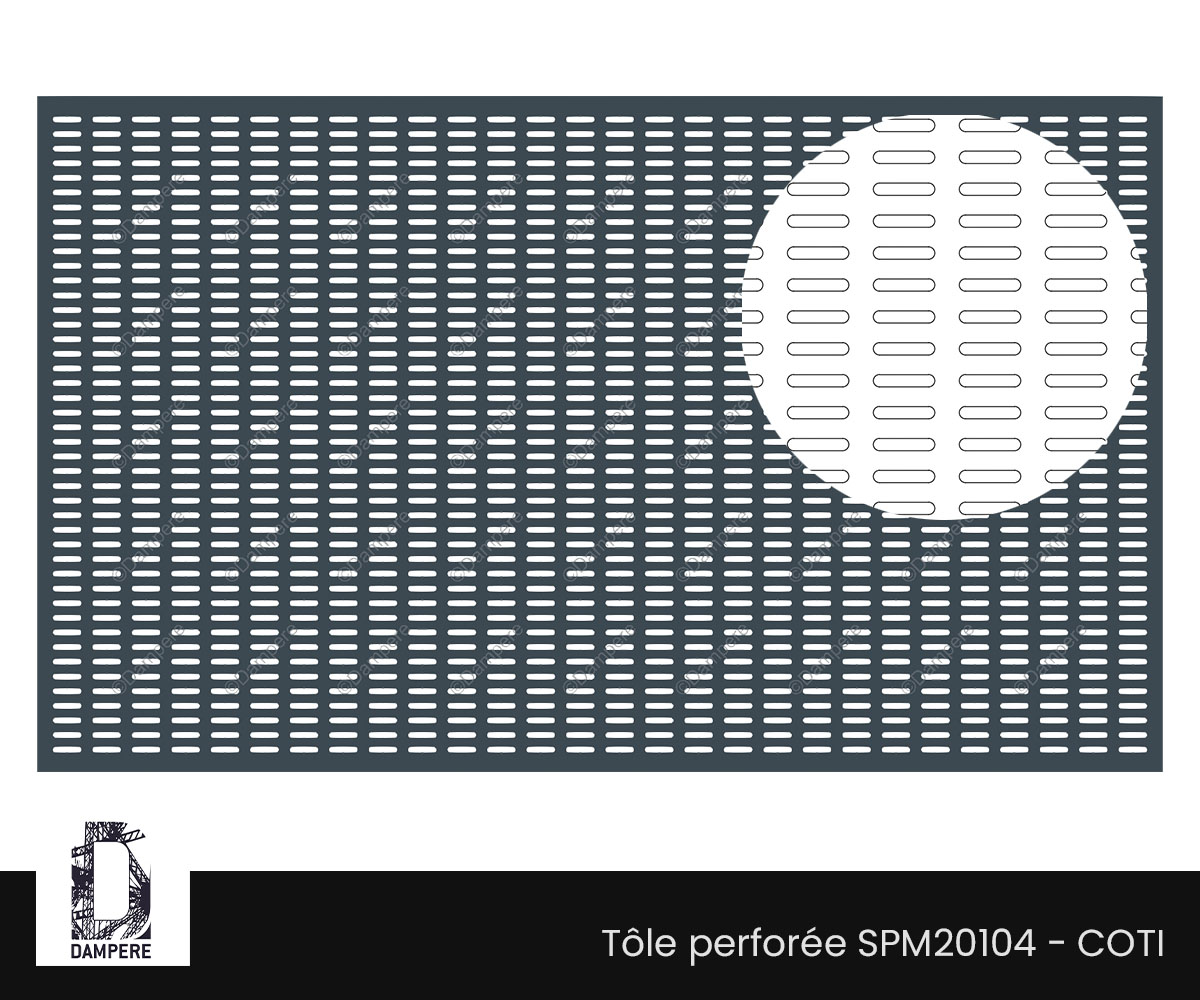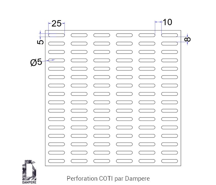 Le trou perforé en oblong de 5×25 mm imprime une lecture graphique élégante et directionnelle. Posé à l’horizontale, il allonge visuellement les clôtures urbaines et allège le volume habillés; à la verticale, il accentue la sensation de hauteur et favorise la vue dans un brise soleil. Ce motif perforé convient aux parements rapportés, portes de locaux techniques, capotages d’équipements d'ordures ménagère, cloisons ajourée et mobiliers urbains modernes lorsque l’on recherche, une ventilation modérée et un masquage efficace de l’arrière-plan.