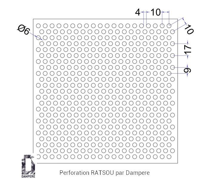 La tôle perforée R6T10 Ratsou propose une écriture fine et régulière : des petits ronds de diamètre Ø 6 mm agencés en quinconce sur un pas constant de 10 mm d'entraxe. Sous la désignation standard de perfo Rv6-10, cette géométrie perforée régulièrement délivre environ 32 % de vide, un ratio pertinent quand l’objectif est d’assurer un passage d’air utile, une transmission lumineuse mesurée et un rendu visuel homogène en protégeant des regards indirect. La maille triangulaire favorise une diffusion uniforme des ouvertures : le tramage d’ombres reste doux et peu directionnel par son effet de moirage; en lecture lointaine, la surface s’apparente à un voile métallique continu et apaisé, un mirage en métal.