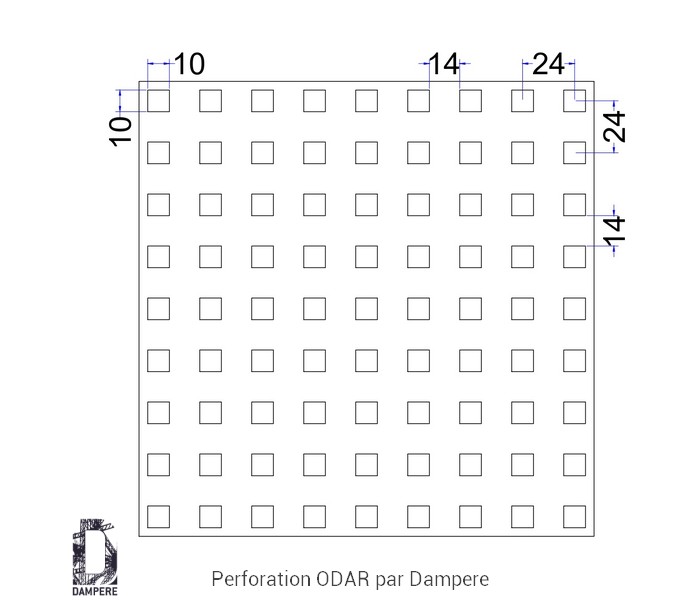 La tôle perforée C10U24 – Odar se distingue par ses ouvertures carrées de 10 mm de côté, organisées en trame rectiligne, selon un entraxe régulier de 24 mm. Ce motif orthogonal, désigné sous la référence Qg10-24, propose un taux de vide de 17 %, soit la transparence adéquate pour des écrans semi-opaques. Disponible dans la famille des perforations carrées standard, son faible jour permet à la tôle de conserver une masse métallique dense tout en autorisant une légère aération naturelle.