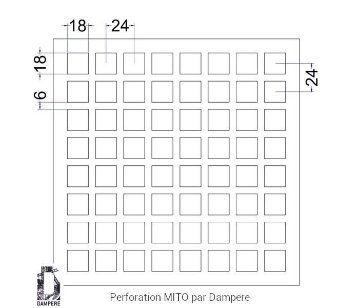 La tôle perforée C18U24 – Mito impose sa présence avec sobriété et efficacité. Composée de trous carrés de 18 mm de côté, alignés en trame droite selon un entraxe de 24 mm, elle dessine une grille géométrique rigoureuse nommée Qg18-24, offrant une transparence de 56 %, équilibré entre transparence et disposition de trou.