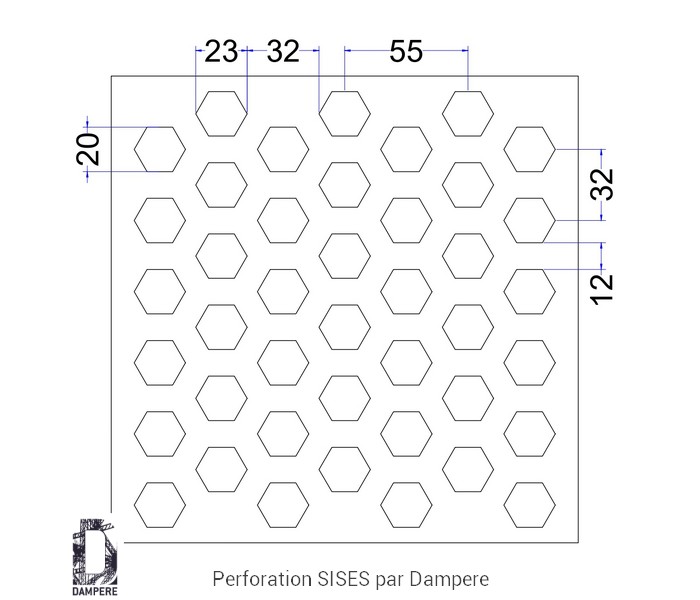 La tôle perforée nid d'abeille avec son trou Hexagonal H = 20 mm et pas T = 32 mm, les ponts de matière atteignent environ 12 mm dans l’axe (T – H ≈ 12) et ~7,7 mm dans l’oblique de la maille triangulaire (√3/2 · T – H ≈ 27,7 – 20). Cette réserve de métal confortable se traduit par une bonne rigidité à épaisseur égale.