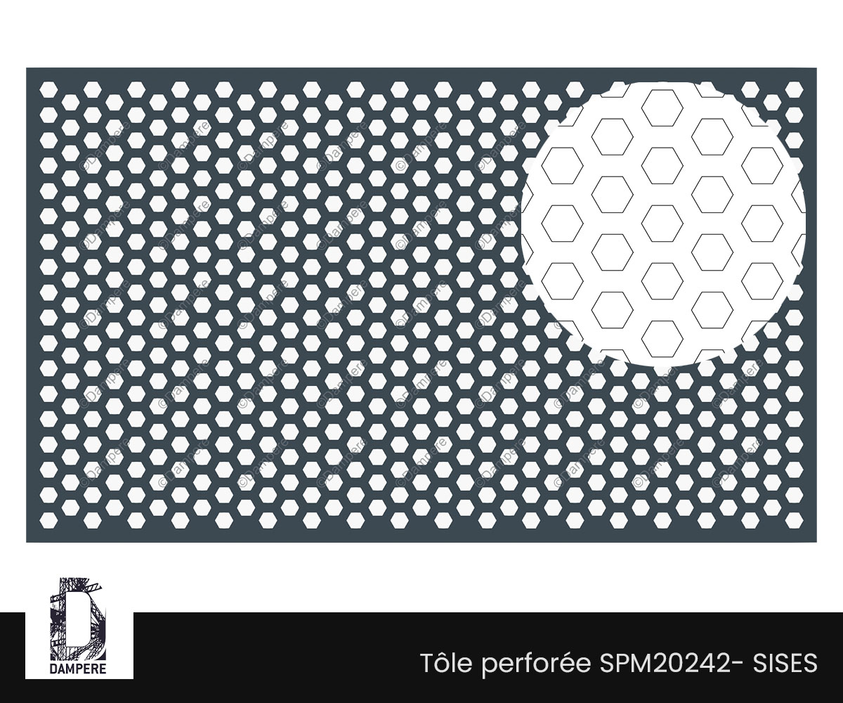 La tôle perforée Sises s’utilise pour les garde-corps, clôtures urbaines, parements de façades. Son motif en moucharabieh hexagonal, inspiré du principe du nid d’abeilles, confère une stabilité naturelle et une lecture graphique élégante. La disposition en quinconce accentue la fluidité visuelle et adoucit les alignements, offrant un rendu visuel à la fois régulier et vivant. Avec un taux d’ouverture modéré de 30 %, la tôle Sises protège des vues directes tout en permettant à l’air et à la lumière de circuler librement. Ce rapport équilibré entre plein et vide en fait un choix privilégié pour les environnements urbains, scolaires, résidentiels et tertiaires.